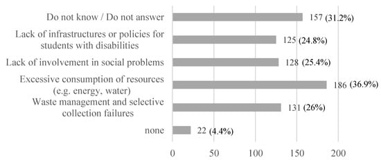 The main problems indicated by the students were excessive consumption of resources (e.g., energy, water) with 36.9%, followed by Do not know/Do not answer (31.2%). Only 4.4% said that there were no problems (Figure 3).