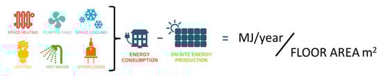 In this study, the evaluation of the energy consumptions is expressed in terms of EUI (Energy Use Intensity). This choice was made due to the fact that EUI is gaining popularity among governmental organizations, nongovernment organizations and building industry groups [1], including American Society of Heating, Refrigerating and Air-Conditioning Engineers (ASHRAE) [24]. This index represents the total energy consumed by a building in one year per unit area, and is usually expressed in MJ/m2/year or kWh/m2/year [25] (1 kWh = 3.6 MJ). In Figure 2, a schematic representation of the meaning of EUI and the parameters that can affect it is reported. Computing this value for each design alternative makes it possible to perform detailed comparisons.