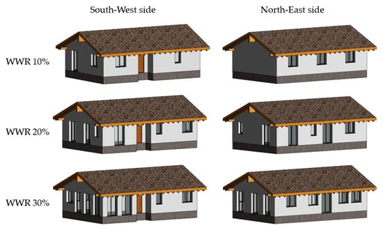 Finally, three different WWRs were defined for analysis: 10%, 20% and 30%. Although WWR is generally defined by external constraints and aesthetic purposes, its impact on the overall building performance, as well as the costs of installation and maintenance, is significant. For this reason, it was decided that this aspect should also be investigated. Figure 3 shows the three different layouts.