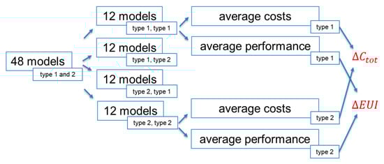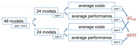 First, the 48 models were divided into two subgroups, each containing models with the same building component typology (Wall type 1 and 2 in the provided example). The mean values of the total costs (at each epoch) and EUIs of the subgroups were then calculated. These averaged values represented a summary of all the combinations containing a given single element. Based on these four values, ∆Ctot and ∆EUI were obtained, and hence, also IR, as their ratio. Figure 4 expresses this concept graphically.