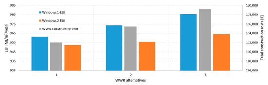 Some preliminary considerations should be noted about the WWRs that were investigated. As shown in Figure 6, an increase in construction costs, due to the presence of a higher number of windows, always corresponds to an increase in consumption, since the U-values of the windows are consistently higher than those the walls; this result is obviously time and space independent. Therefore, the following considerations are valid for both the Milan and Livigno cases, and for any considered life cycle. Considering the two windows typologies separately, by adopting the most efficient windows the impact of changing WWR decreases significantly, but never in such a way as to show a reverse trend, making this parameter unmeaningful in the proposed approach, also considering the fact that WWR is usually set by external constraints (aesthetic or regulations).