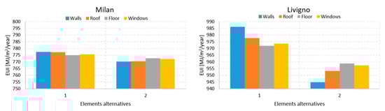In terms of energy consumption (Figure 7), it can be noted that adopting more efficient building components leads to different energy savings depending on the type of climate. Disregarding the fact that the expected energy consumption in a milder climate is lower, in Milan, for all the building components, the energy saving was similar, i.e., roughly 2%. On the other hand, in Livigno, the impact is greater and differences between building components are clearly visible, with the more efficient walls obtaining improvements of up to roughly 4%, despite the minimum requirements for Livigno being higher, as explained in the previous paragraph.