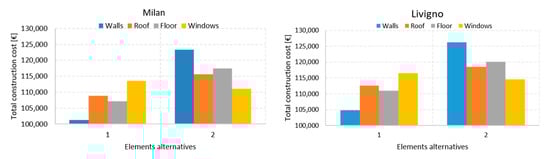 In this case, the subgroups were smaller and contained only models with both components of the same typology. For instance, in case of assessment of the “Walls” and “Roof” building components, only models containing Walls type 1 and Roof type 1 were considered, as well as for type 2 models, for a total of 24 models out of the 48 available ones. During construction, the type 1 combination had an average EUI of 780.8 MJ/m2/year with an average total cost of 97,844.25 €, while the type 2 combination had values of 766.8 MJ/m2/year and 126,756.08 €. The resulting IR was then 2065.13 €/EUI. The computation and comparison of the investment ratios for both the Milan and Livigno cases, during all phases of an expected life cycle of 100 years and for both single and double building components, provided a broad overview of all design alternatives, making it easier to find the optimal solution.