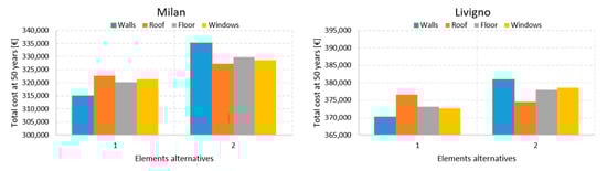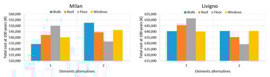 As far as the other four components under analysis are concerned, in Figure 7, Figure 8, Figure 9 and Figure 10, energy consumption and total costs are reported for both mild and cold climate zones (Milan and Livigno, respectively) and for different considered life cycles (0, 50 and 100 years, respectively) in order to be able to analyze them separately.