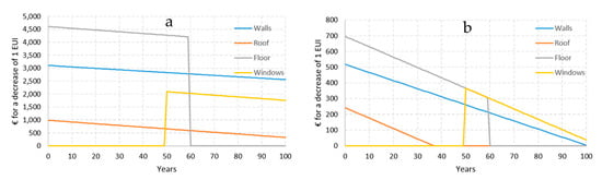 For life cycles of up to 100 years, the initial investments on more efficient roofs and floors are totally justified. This is due to the fact that planned maintenance operations on the less efficient floor and the inferior thermal properties of the less efficient roof make them economically unviable. A smaller IR is then obtained again by walls. In fact, after 100 years of usage, choosing the more efficient wall typology gives rise to additional costs ∆Ctot of 170.23 €, but to an energy saving ∆EUI of 41.3 MJ/m2/year with a resulting IR of 4.12 €/EUI. As such, for an expected life cycle of up to 100 years, the investments should be made first and indifferently for roofs and floors, followed by walls and then for windows.