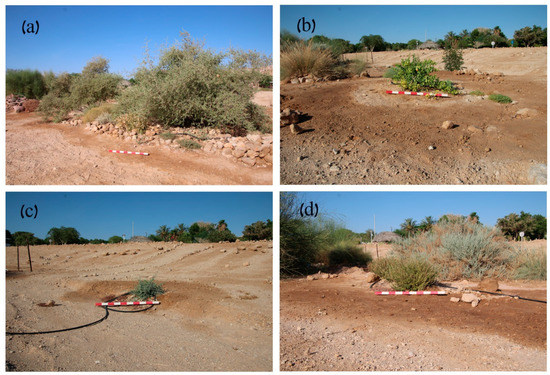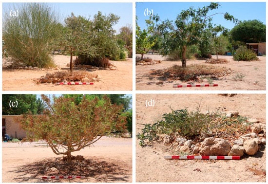 On-site use of plant litter and pruned branches as mulch reduces evaporation and negates soil salinization in planted vegetation patches of Senegalia laeta (R. Br. Ex Benth.) Seigler and Ebinger (a), Pistacia atlantica Desf. (b), Boswellia carterii Birdw. (c), and Commiphora myrrha (Nees) Engl. in the center and Senna italica Mill on the left (d). The 1 m stick shows the scale. These plants are either native or considered to be historically native in the hot Arava drylands of southern Israel. The pictures were taken by the author.