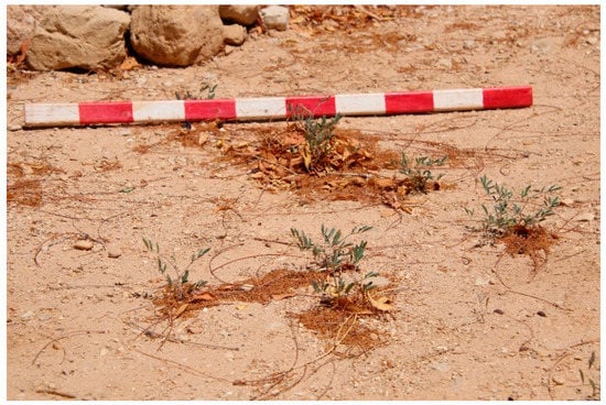 Trapping of off-site, wind-transported organic debris by the canopy of spontaneously sprouted native Tephrosia apollinea (Delile) Link plants. The 1 m stick shows the scale. The picture was taken by the author in the Arava drylands of southern Israel.
