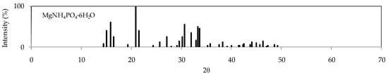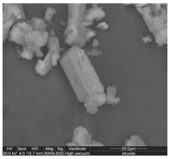 Struvite type crystals consist of orthophosphate (PO43−), magnesium (Mg2+), and mono or bi-valent ions such as ammonia (NH4+), potassium (K+), sodium (Na+), copper (Cu2+), nickel (Ni2+), lead (Pb2+), manganese (Mn2+) [9,36]. Magnesium ammonium phosphate (MgNH4PO4·6H2O) (acronym MAP), is the most common and stable form which is characterized by a crystalline white orthorhombic prismatic structure (Figure 1). The struvite can be identified through X-ray diffraction (XRD) analysis by comparing the diffractogram of the solid under examination with that of pure compound (Figure 2). The formation occurs when the concentrations of constituents exceed the solubility product. Precipitation takes place according to the following equation [12]: