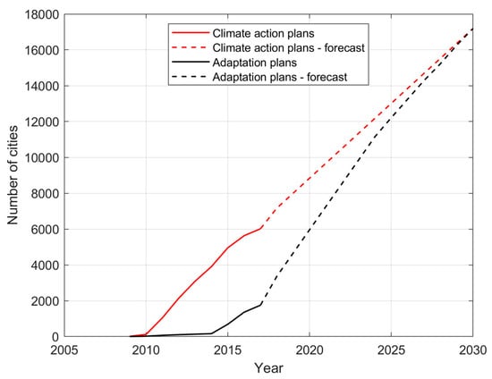 Forecast of the number of signatories to the Covenant of Mayors [57] of Energy and Climate, 2018–2030. The figure shows the number of Sustainable Energy and Climate Action Plans (red line) and Adaptation Plans (black line).