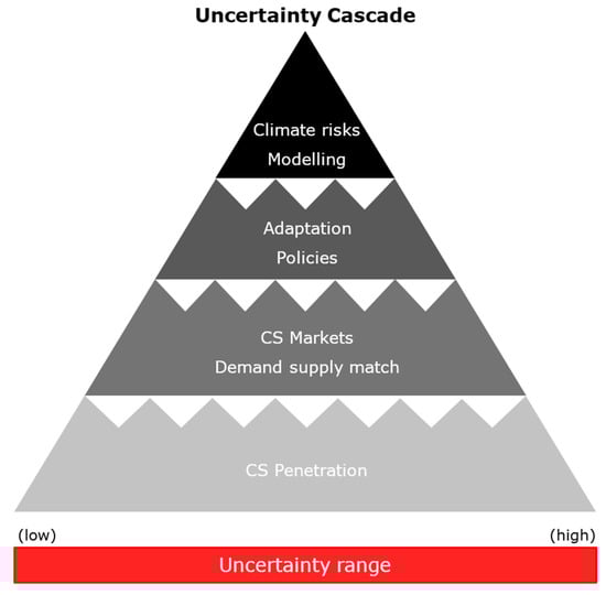 The development of context-specific CS products and their penetration will face large uncertainties, including those associated with climate and socioeconomic information (appropriate, relevant and high-quality climate, impact and damage data), as well as the condition that a CS user community is in place with the capacity and governance to demand CS and to use it to implement adaptation options [70]. The combination of all these uncertainties amounts to a cascade of uncertainties.