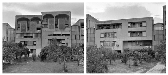 The described methodology was applied to a housing module located in the municipality of Rende, in the south of Italy, within the COGITO project “COGnitive dynamIc sysTem to allOw buildings to learn and adapt” conducted by the University of Calabria, Italy. The area includes a number of 1970s-style buildings intended for social housing (Figure 2). The basic module consists of two units (hereafter referred to as module A and Module B): a three-story building and a five-story building, connected by access ramps inserted between the buildings. The various blocks have been assembled in such a way as to have a curvilinear plan, while, in elevation, the facade is articulated by the alternation of different heights.
