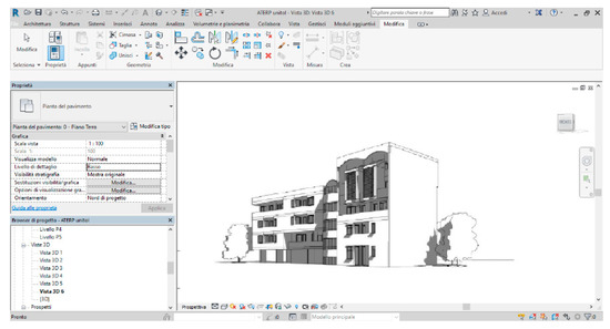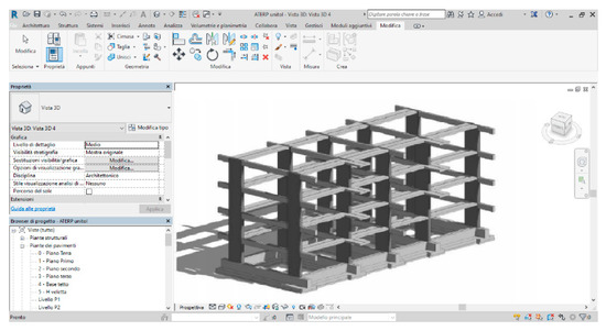 The subject property of the analysis is just one block (Module A), consisting of three floor levels and six apartments. It was implemented in a BIM model through the Revit software. It is a virtual model containing a series of information about geometry, materials, and bearing structure. In the implementation of the virtual model, the structural component was first recreated (Figure 3), followed by the architectural one (Figure 4).