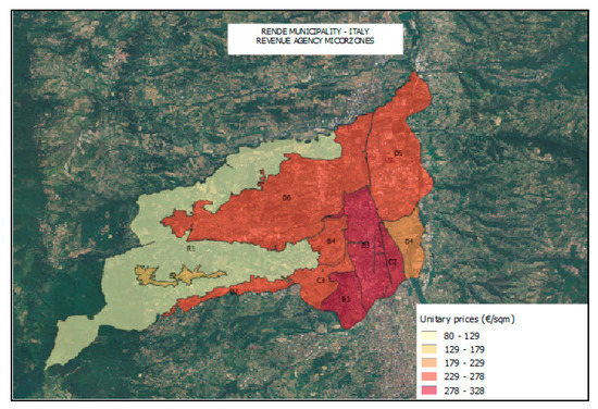 In the GIS platform, the real estate database was previously built by acquiring information from the Revenue Agency (Figure 7, 2019 survey) [62]. In particular, land values were calculated in each homogeneous area using the area impact coefficient on real estate prices (18% ratio, detected among real estate operators in the subject area) and by considering an area extension represented by the footprint area of the building (through an intersection tool).