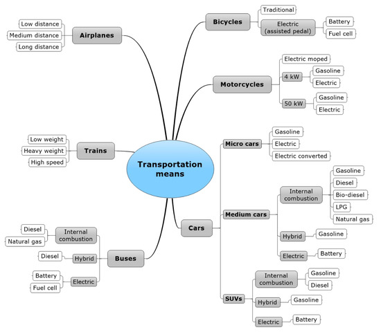 All the considered transportation means can be classified according to their type, size, and power supply.