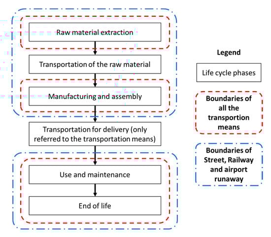 The material extraction and the manufacturing phases of all the transportation means were included in the study, because the scope of the study is from “cradle to grave”, and they can be significantly different between the alternative transportation means and there are fundamentals to compare them. Transportation of raw materials from extraction points to manufacturing sites and transportation related to distribution were excluded from the study to avoid distorting the overall comparison between the alternative transportation means that are produced in different places and due to the variability over time of the location of the production sites.