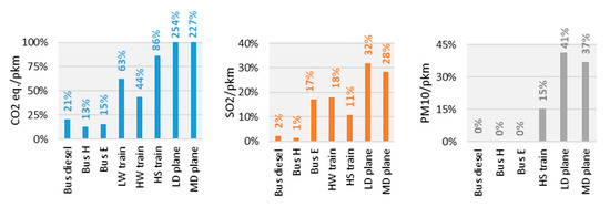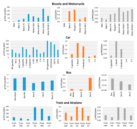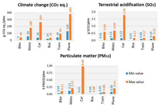 The achieved results about the environmental impacts of the transportation means, expressed in g CO2 eq., g SO2, and g PM10 and normalized per 1 passenger per 1 km (pkm) are summarized in Figure 3 in an aggregate manner according to the types of the transportation means by showing the minimum and the maximum impacts arising from their different considered models. This representation was selected because it allows the readers to compare the contributions of the three impacts categories of each transportation means in relation to a common reference, or the functional unit, and to comprehend their variability depending on the models.