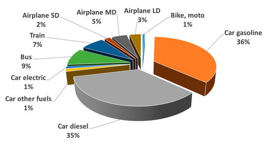 The geographical coverage of the study is limited to the EU-28 scenario, in which the most widespread transportation means and infrastructures can be significantly different from those of other areas of the world, also greatly affecting the overall environmental impacts of the scenario [42]. In addition, the provided perspective is quite narrow, as it is levelled on the European average value, and, unless otherwise specified, i.e., within the sensitivity analysis, the comparison is limited to the average features of infrastructural, geographical, and climatic aspects without explaining their differences between the regions, which can also be significant [43]. The completeness of the study is also limited by the perspective provided about the ethnographic habits of the considered population. Significant differences can be detected by comparing the preferences and choices about the transportation means of the populations of the European countries, which are also conditioned by their different per capita income and environmental awareness [44].