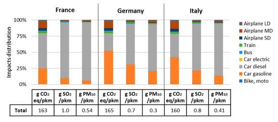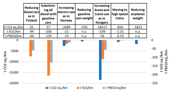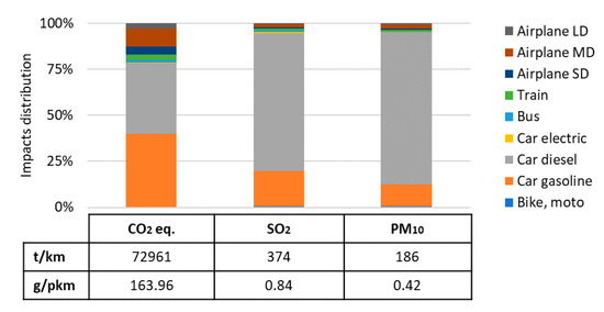 In conclusion, the proposed study provided all the elements for a rough quantification of the impacts of the transportation means and the aggregate value at the European level: airplanes have the highest impacts of CO2 eq./pkm, while cars have the highest impacts of SO2/pkm and PM10/pkm; overall, cars account for almost all impacts of the EU-28; the greatest advantages were achieved by adopting more buses and trains and reducing the number of diesel cars.