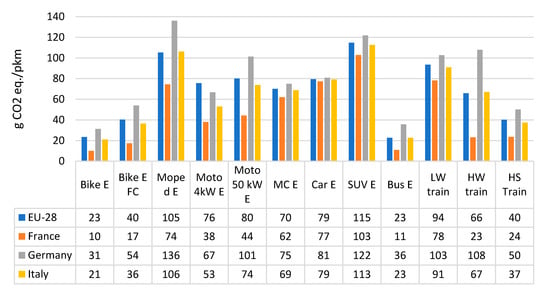 The impact categories for the analysis were selected among the most commonly used in LCA studies about transportation (e.g., [8,34]) in order to allow the comparison: climate change (g CO2 eq.), terrestrial acidification (g SO2), and particulate matter formation (g PM10).