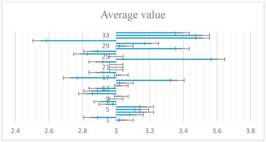 The survey data were tabulated using the SPSS statistics program, and the average value of each item in the questionnaire was calculated. We used descriptive statistics to study the particularity of the options, so as to investigate the inclination and difference in each question, as well as the most influential factors affecting demotivation from Chinese language learning. The data for the descriptive statistical analysis in the Appendix A represent a correlation analysis between demotivation and the nine predicting variables mentioned above, so as to reveal the main reasons contributing to demotivation in Chinese language learning. For clarity, the horizontal axis in Figure 1 represents the average value of each question, while the vertical axis represents the numbers of the questions. The average value corresponding to the vertical axis is 3. This table shows the distribution of each item’s average value: the higher the value of the option is, the greater the impact that this option has on students’ Chinese language learning motivation. For instance, question 25 ranks the highest, at 3.606, and therefore it is shown in the chart as the longest segment on the right-hand side of the chart; question 31 ranks the lowest, with 2.545, and is shown in Figure 1 as the longest segment on the left-hand side of the chart.