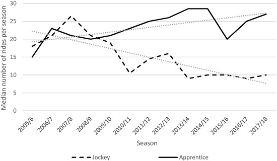 The median number of rides per season for flat racing jockeys decreased by 8% per season (R2 = 0.7) whilst that for flat racing apprentices increased by 3% (R2 = 0.4, p < 0.001) over the study period, as shown in Figure 1. The median number of rides per season for apprentices in their last season (before becoming jockeys) was 216 (IQR 29–415), whereas the median number of rides in their first season riding as a licensed jockey was 74 (IQR 12–170, p = 0.2).