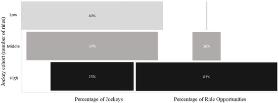 The objectives of this study were to quantify the external workload of thoroughbred racing jockeys in relation to their experience and racing performance. The number of rides of 786 jockeys and apprentices who rode in 407,948 flat and 13,648 jumps racing starts over 14 seasons were examined. Jockey work (ride numbers, seasons riding) and performance characteristics (race falls or wins) between cohorts with low (1–10), middle (10–200) and high (>200) numbers of rides per season were compared. Flat racing apprentices had more rides per season (25, interquartile range [IQR] 7–97 vs. 14, IQR 3–222, p < 0.001) but fewer rides per race day (2, IQR 1–4 vs. 4, IQR 2–6, p < 0.001) than flat racing jockeys. Flat racing jockeys in the high workload cohort (23%) were responsible for 83% of the race-day rides, riding in a median of 375 (IQR 283–520) races per season. These jockeys had half the fall rate (Incidence rate [IR] 1.0, 95% CI 0.9–1.1) and 1.4 times the success rates per 1000 rides (IR 98, 95% CI 97–99) than jockeys in the low and middle workload cohorts (p < 0.05). Most jockeys had light workloads, greater risk of injury and lower winning rates than the smaller cohort of jockeys with heavier workloads. This disparity in opportunity and success between cohorts indicates inefficiencies within the industry in recruitment and retention of jockeys. These data provide a foundation to further studies investigating jockey competition-specific fitness and its effect on both riding success and reducing injury risk.