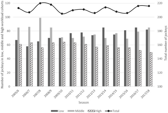 The high workload cohort of flat racing jockeys comprised 23% of the total number of jockeys riding in flat races but accounted for the majority (83%) of race-day rides (Figure 2). Flat racing jockeys who were classified as riding in the high workload cohort at least once during the study period spent a median of three seasons (IQR 1–6) riding in the high workload cohort, but spent a median of two seasons (IQR 1–3) riding in the middle workload cohort and a median of 0 seasons (IQR 0–1) riding in the low workload cohort during their riding career.