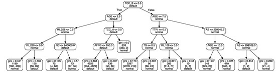 Figure 1, on the other hand, shows the decision constructed by the CART model, which uses the Gini impurity index to select variables for classifying data. The Gini impurity index is a measure of how often a randomly chosen element from the set would be incorrectly labeled if it was randomly labeled according to the distribution of labels in the subset. From the tree structure of the CART model, we can judge which combination of the variables can have the highest purity to classify the dependent variable. For example, for the node with a Gini index score of 0.184, the first factor examined concerns whether a company has been assigned a “B” TCC code. The entire decision covers four levels and can achieve an accuracy value of 0.86. Branch via Age > 2.5 to covers 4926 cases, among which 4422 defaulted. Another node has a Gini index score of 0.173, and branch TCC = B, via Age ≤ 7.5 TTRI = 0 TS = 0 covers 2297 cases, among which 219 defaulted; from this we can infer that a company without TTRI, TS, TCC = B and Age ≤ 7.5 may have a higher probability to be a non-default company, which is in accordance with the argument in the variable selection section.