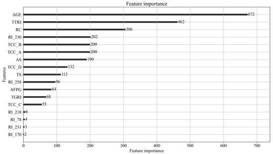 Through the application of LightGBM, the feature importance of explanatory variables can be determined. Feature importance is measured as a score that represents how dominant each feature is within a model. The higher the score is, the larger the forecasting capacity of a variable. The results displayed in Figure 3 show that company age (Age) exhibits the strongest capacity followed by the number of tax regulation infringements (TTRI), registered capital (RC), the registered industry (RI230: wholesale textile products industry), tax compliance classification (TCC classes B and A), amount sued for (AS), tax compliance classification (TCC class D), number of lawsuits (TS), the registered industry (RI258: farming industry), the sum of fines paid to the government (AFPG), and the number of times that government regulation infringement occurred (TGRI).