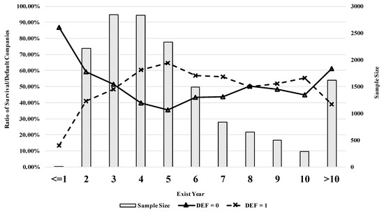 As shown in Figure 4, relatively few companies default in their inauguration year. However, over the next 1 or 2 years, the default ratio climbs quickly, and by year 5 it peaks with 64.62% of companies having defaulted. This trend then reverses, and the lowest value of 38.82% is reached once SMEs have operated for more than 10 years.