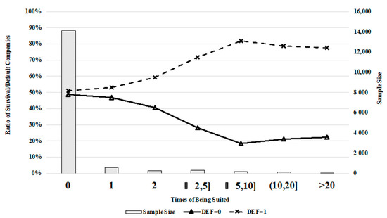 The study in [47] identified lawsuits and structural change in a regulated industry as two main causes of bankruptcy. The author in study [32] asserted that poor corporate governance results in deteriorating financial conditions and may lead to debt. The present study confirms a strong relationship between defaulting and the number of lawsuits faced. As shown in Figure 6, the rate of defaulting increases steadily with the rising number of lawsuits.