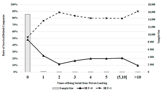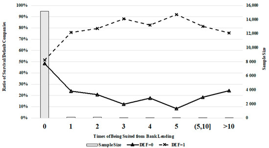 This is the case because default companies can encounter many kinds of lawsuits such as labor disputes, contract disputes, and lawsuits related to financial lending. We were also able to confirm that legal disputes with banks and private lenders have major impacts on SME survival. Figure 7, Figure 8 and Figure 9 show changes in the rate of defaulting with the number of times the company was charged by private lenders, banks declaring lost credit, and number of listings in untrustworthy records.