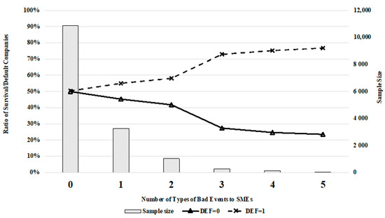 Distribution of DEF by the number of types of bad events to SMEs. Source: Own elaboration.