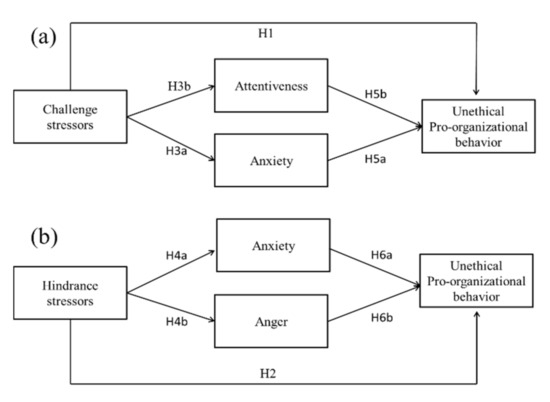 Summary of hypothesized relationships between (a) challenge stressors and (b) hindrance stressors and unethical pro-organizational behavior (UPB). Source: authors’ own compilation.