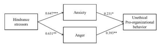 SEM 4 was established with anxiety and anger as mediating variables to test the mediating mechanism of hindrance stressors on employees’ UPB. As the direct path coefficient from hindrance stressors to UPB was not significant, we deleted this path and constructed a selection model (Model 5). The selection model (Model 5) compared with the benchmark model (Model 4) did not change the fitting index significantly. Therefore, the reduced model (Model 5) (χ2/df = 2.114 < 3, CFI = 0.908, TLI = 0.899, RMSEA = 0.067) was selected as the best matching model (Figure 3). With the bootstrap method, the mediation effect was tested by 2000 bootstrap samples. The total effect (total mediation effect) between hindrance stressors and UPB was found at 95% CI, and did not include 0 (β = 0.398, 95% CI = [0.212, 0.698]) (Table 3). As predicted in H4a, hindrance stressors were positively related to anxiety (β = 0.647, p < 0.001). A significant positive correlation was shown between anxiety and UPB (β = 0.231, p < 0.05). The mediation effect of anxiety in the relationship between hindrance stressors and UPB was 0.150, 95% CI = [0.037, 0.384], excluding 0 (Table 3). Thus, H6a was supported. As stated in H4b, a significant positive correlation was observed between hindrance stressors and anger (0.631, p < 0.01). The path coefficient from anger to UPB was 0.393 (p < 0.01), and the mediation effect of anger in the link between hindrance stressors and UPB was 0.248, 95% CI = [0.114, 0.491], excluding 0 (Table 3). Thus, H6b was supported.