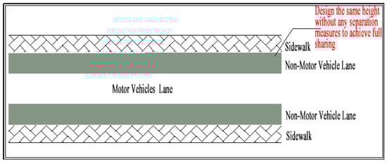 Slow traffic usually refers to manually driven traffic, such as walking or non-motorized vehicles, which is an important part of urban residents’ travel. However, with the rapid improvement of the degree of motorization, urban transportation resources tend to be excessively motor vehicles, the slow-moving space is severely compressed, and pedestrians are mixed with bicycles and electric cars. This study calls it a shared-use path used by pedestrians, cyclists, and electric bicycle riders. Shared-use path is a road resource that pedestrians and non-motor vehicles can use simultaneously. In this design mode, there is no height difference between sidewalks and non-motor vehicle lanes, and space can be utilized mutually (as illustrated in Figure 1)