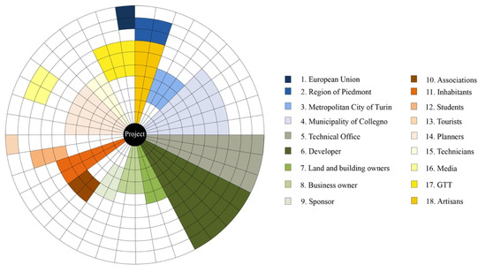 The Stakeholder Analysis (SA) is a technique used to define strategies through the identification of the key actors within their objectives and interests [52]. In detail, identifying and analyzing the interest of the different stakeholders is fundamental within urban regeneration processes [53,54]. Thus, it is possible to identify in advance possible conflicts among them and also to better recognize their needs and requirements [54]. From the practical point of view, stakeholders are classified according to their objectives and to the resources that they can carry out in the process (i.e., political, economic, legal, and cognitive resources) [52]. Therefore, it is possible to divide stakeholders into five categories, namely political, bureaucratic, special interest, general interest, and experts. Different methodologies can be applied to map stakeholders and actors, such as the Power/Interest Matrix [55], the Stakeholder Circle Methodology [56] and the Social Network Analysis [53,54,57].
