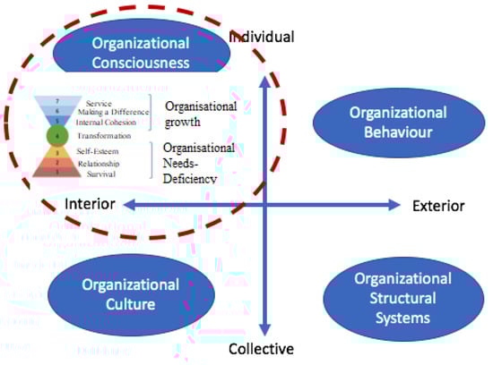 Rooted in organisational development literature, Wilber’s integral metatheory [] is intended to be applied at any macro-, meso- or microlevel of an organisational system to describe alternative organisational development paths []. For instance, Landrum and Gardner [] used Wilber’s Integral theory to describe the strategic changes required of organisations seeking to lead in organisational sustainability. Wilber’s integral theory consists of quadrants based on: (i) an axis of the interior–exterior dimensions between the inner world of subjectivity and the outer world of objectivity; (ii) an axis of individual–communal dimensions referring to the relationship between individual identity or agency; social identity or communality. The consciousness quadrant represents the interior of the individual, while the behavioral quadrant represents the exterior of the individual. The cultural quadrants stem from the interior of the communal dimension, while the social quadrant represents the exterior of the communal dimension. Wilber’s integral theory [] views the interaction of these dimensions as providing the fundamental domain through which all developmental change can be represented and assumes that change in one quadrant will affect functioning of the other three quadrants []. For strategic change to occur, all four quadrants must, therefore, be addressed, with change beginning at the inner individual level yet continuing to affect change in all other quadrants [].
