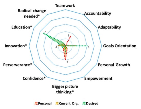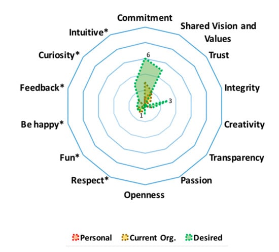 Indeed, literature on the importance of value clarification and values alignment for organisational sustainability transformation processes is sparse in the sustainable business literature. For instance, much of the Corporate Social Responsibility (CSR) literature focuses on making structural changes such as with sustainable business models. Moreover, of those studies that explore personal and organisational value alignment for sustainability (e.g., []), none incorporate a future dimension, i.e., they fail to investigate alignment with desired, future organisational values. That being said, there is a growing body of literature that focuses on supporting individuals in change processes for greater organisational sustainability; however, it does so by addressing competences for sustainability, mostly from an educational perspective [,,]. Branson [] argues that values alignment between the individual and the organisation is commonly overlooked, and that too much emphasis is placed on the structural and functional components of organisations. This is indeed surprising given that Rice and Marlow [] argue that a lack of alignment is “the silent killer” of engagement (p. 140). Rice and Marlow [] claim that misalignment is so easily overlooked in the engagement equation because (i) leaders assume alignment exists and (ii) definitions of engagement focus on job satisfaction, rather than addressing contribution and performance.