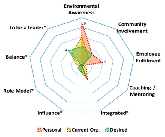 Responses to relevant questions were coded in accordance with the attributes listed in Box 1 of Barrett’s OC model, cross-referenced to the three types of values requiring alignment (current personal, current organisational and desired organisational). Additionally, sustainability-related attributes referred to by the participants were also coded. Where statements matched more than one attribute, they were multiply coded. The number of participants making such statements, corresponding to each attribute, was then plotted as spider diagrams for rapid visual comprehension. This combination of categorical text analysis is a strength of quantitative content analysis methodology in that “it preserves the advantages of quantitative content analysis but at the same time applies a more qualitative text interpretation” [] (p. 25). The statements affiliated with each attribute were then analysed in detail for their degree of specificity and repetition across all three sustainability perspectives to ascertain the degree of alignment among all three perspectives for each individual participant in the study.