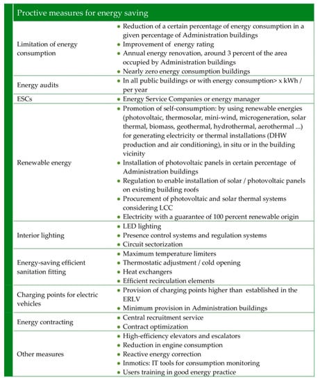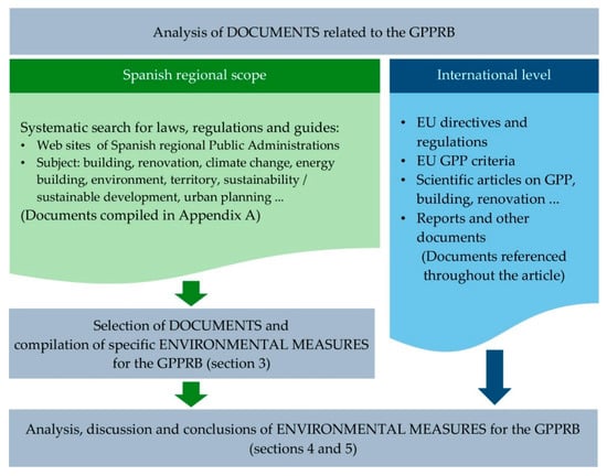 At the same time, other international sources on implementing environmental measures in buildings and GPP were analyzed. Particularly, legal framework and criteria for the EU GPP, as well as other articles and papers outlined in this article, were taken as a basis. The study of all documentation allowed a rough idea of the situation and issues of the GPPBR, as explained in Section 1. All of this made it possible to enrich the analysis, discussion and conclusions of the measures collected within a broader context, as Section 4 and Section 5 show.