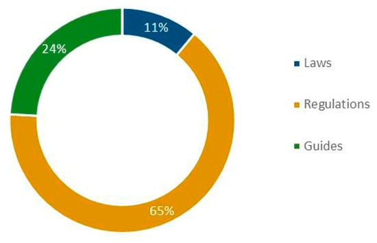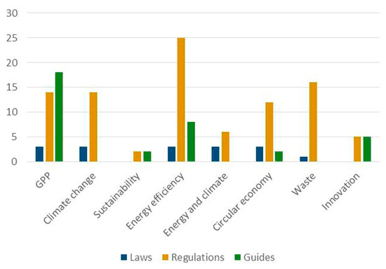 Next, by entering each site, a search on subjects about sustainability in construction and GPP was carried out: building, renovation, climate change, energy efficiency, circular economy, waste management, public procurement of innovative solutions (PPI), environment, territory, sustainability, and urban planning. This search led to different web sites of regional governments: departments, councils and organizations for energy, business competitiveness, building, housing, land, etc. General and specific tools were found about the implementation of measures in the GPP and building renovation. Appendix A contains a broad list of laws (L), regulations (R) and guides (G) found (a total amount of 145 papers). Figure 2 and Figure 3 provide a summary of the main topics and the percentage that each type of tool represents over the total analyzed. Figure 4 and Figure 5 show the main topics related to the documents found.