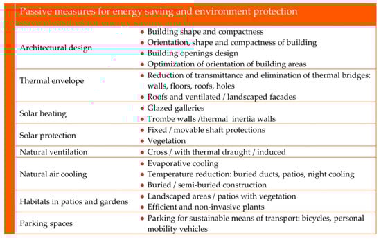 - Reduction in the demand for energy consumption by lowering wall thermal transmittance, floors, roofs, openings and removing thermal bridges [68,69].