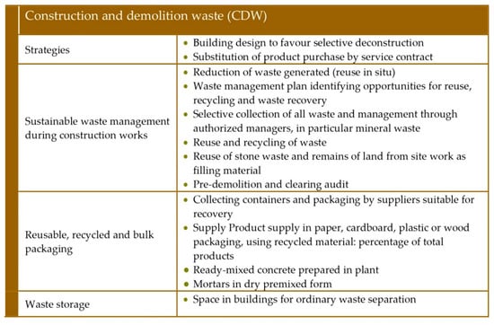 - The Circular Economy Strategy [27], which considers building sector and building renovation with own relevance in the materials cycle, climate change, resilience and local economy, among others. It also has a high level of improvement concerning treatment of construction and demolition waste (CDW) and optimization of resources used.