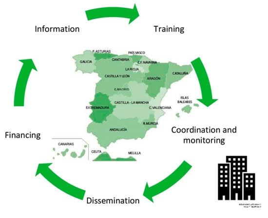 - The Draft for National Integrated Energy and Climate Plan 2021–2030 [25], with measures aimed at reducing primary energy consumption and promoting renewable energies. It provides for energy renovation over 3% of the built-up area in public buildings of the General State Administration, and at least 3% of the buildings of regional and local administrations.