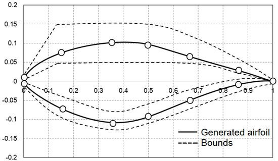 The set of knots is {}, k = 1, 2, …, and i = 0, . This study uses the B-spline airfoil with 13 control points and k order seven according to its proven usefulness in reference [31], see Figure 1.