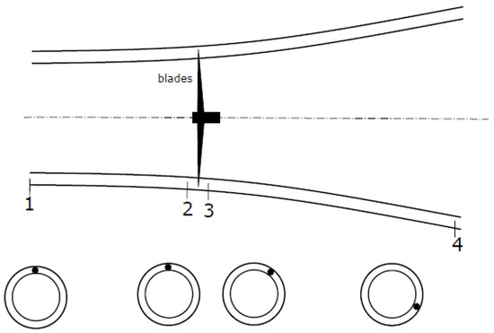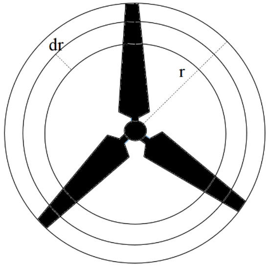 Each stage of the rotating annular stream tube from stages 1 to 4 are in Figure 4. After wind passes through steps 2 to 3, the wind rotates to make the rotational flow, called a wake. When the angular velocity of the rotating flow is with the blade angular velocity , the conservation of momentum makes the torque calculation available. Based on the rotor radial element concept in Figure 5, the elemental torque can be found with the rotating annular element of fluid at radius in Equation (6).