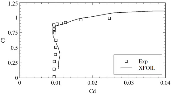 Computed lift and drag coefficients predicted using XFOIL in comparison with the Exp [28].