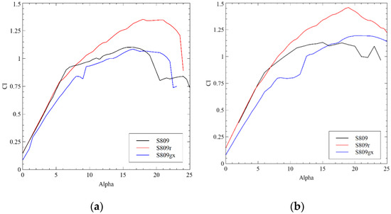 The lift, drag, and pressure coefficients for two different Re number situations are calculated, see Figure 15, Figure 16, Figure 17 and Figure 18. First, Re = with free stream velocity 8.5 m/s and Re = with the free-stream velocity 15 m/s. The modified leading-edge radius airfoil S809r shows the highest lift coefficients at both Re conditions. The airfoil s809r shows the larger lift coefficients at the higher alpha regime, which show its better tolerance at the stall effect. Moreover, the reference airfoil S809 shows the highest drag at both Re regimes.