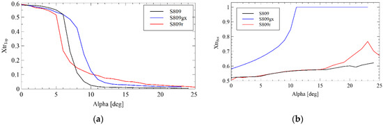 The transition points where the boundary layer turns turbulent from the laminar at different angles of attack are described in Figure 23a. The airfoil S809gx which was designed to have the higher laminar boundary layer over all alpha ranges mostly has the highest laminar region on the upper and lower surfaces of the airfoil, especially at alpha > 10°. However, the rounder leading edge airfoil S809r has the broader laminar boundary layer region at a higher angle of attack. The S809r has a more extensive laminar boundary layer at the higher angle of attack on the upper surface. It is from the rounded nose part of the geometry. In the upper surface of airfoils, the rounded nose at S809r and S809gx causes less change in flow velocity stream and following pressure distribution over the airfoil surface. The smoother flow stream from the less adverse pressure gradient allows the flow particles inside the boundary layer to remain in laminar flow in contrast to the airfoil with a less rounded nose. The leading-edge radius influences the fluid particles inside the boundary layer at the bottom surface less. The symmetricity and the smoothness of the curve affect the transition of the particles from the laminar to turbulence. Although the less symmetric and S-shaped curve of the airfoil S809r and S809 have earlier transition points than the airfoil S809gx in the lower surface, the rounded nose airfoil S809r has the more extensive laminar boundary layer than the less rounded nose at the higher angle of attack.